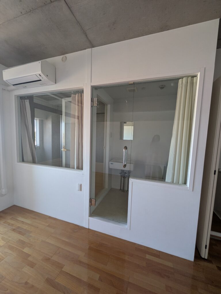 また、浴室はゆったりサイズのハーフユニットバスで、周りがガラス張りなので、